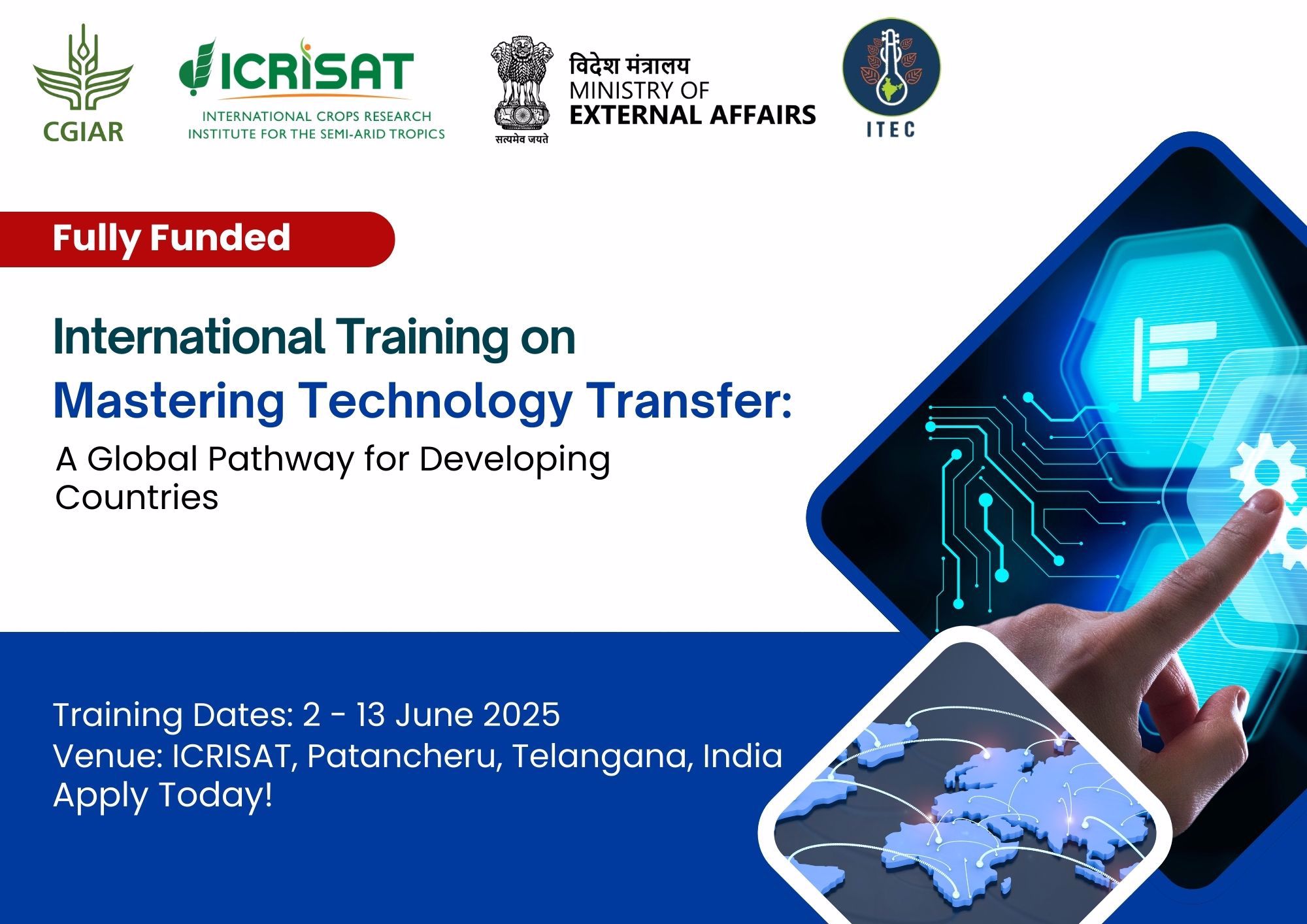 Apply now for the fully-funded, two-week international training program on Mastering Technology Transfer: A Global Pathway for Developing Countries, organized by ICRISAT in collaboration with Indian Technical and Economic Cooperation (ITEC) and the Ministry of External Affairs, Government of India.