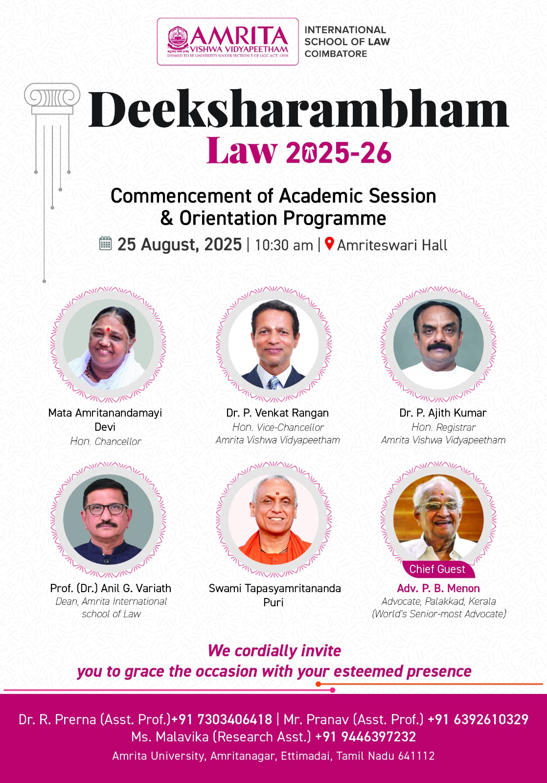 The Inaugural ceremony for the orientation will be held on 25th August 2025 at 10:30 AM at Amriteswari Hall, with the blessings of our Hon’ble Chancellor Mata Amritanandamayi Devi, invocation by H.H. Swami Tapasyamritananda Puri, and in the esteemed presence of our Chief Guest Adv. P. B. Menon (World’s Senior-most Advocate).